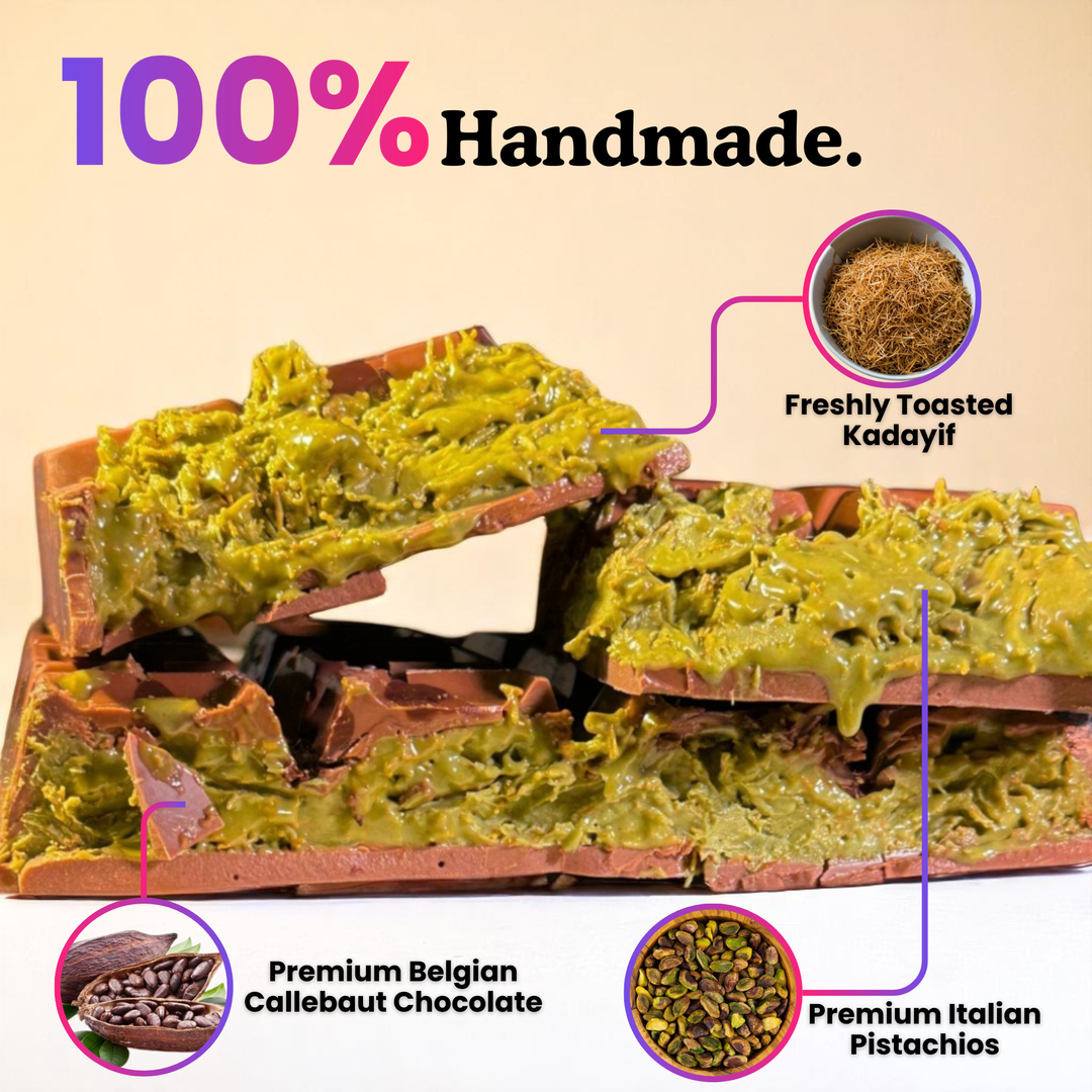 Onze aanpak. Terwijl andere merken de makkelijke weg kozen, gingen wij tot het uiterste. We vlogen naar België en werkten samen met chocolademeesters. Handgeselecteerde Siciliaanse pistachenoten. Authentieke Midden-Oosterse Knafeh. 100% pure ingrediënten.