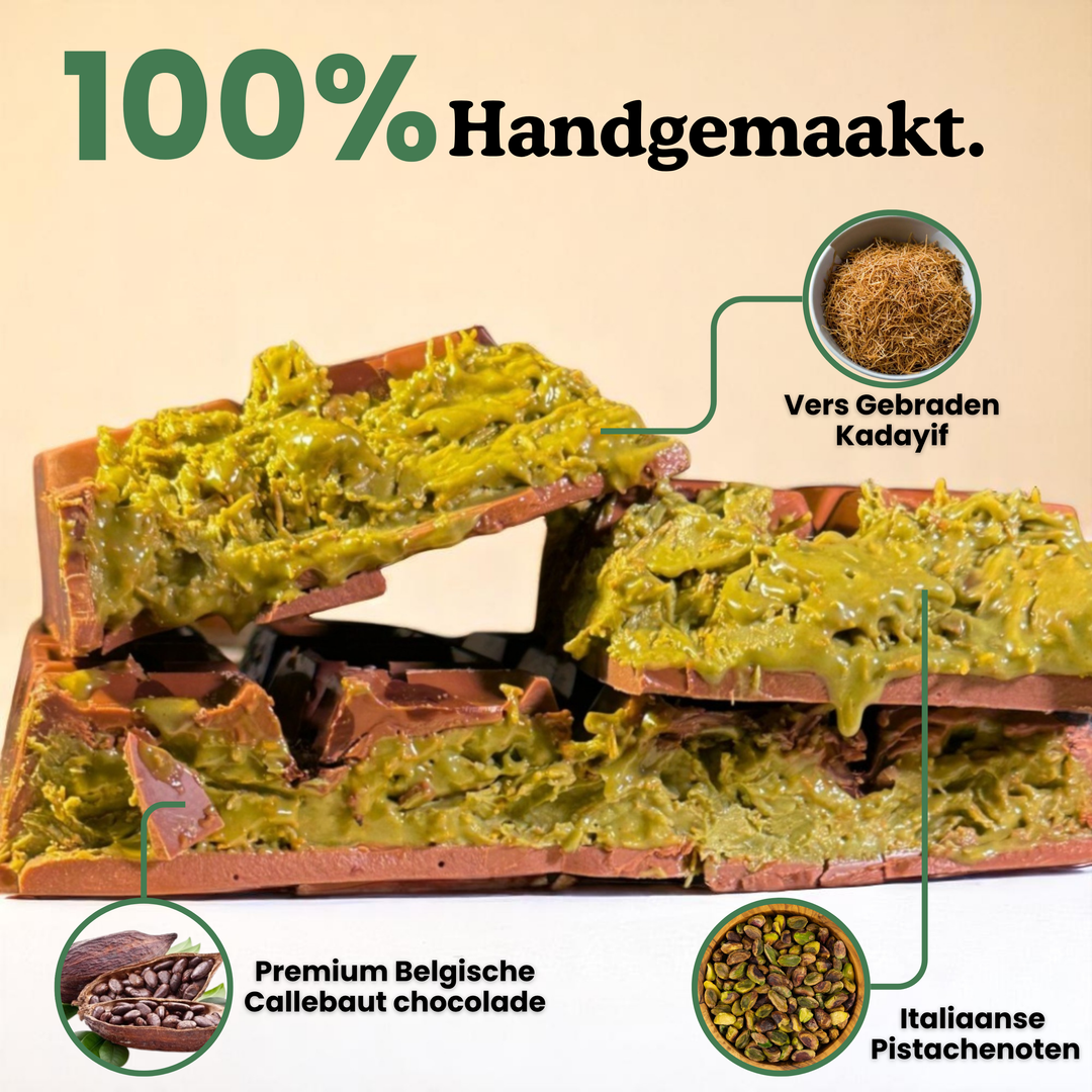 Onze aanpak. Terwijl concurrenten de makkelijke weg kiezen met groene kleurstof, smaakversterkers en goedkope chocolade, kozen wij voor de moeilijke weg. Geen concessies. Wij gebruiken 100% pure pistachepasta (zonder rommel), vers geroosterde knafeh voor die extreme crunch, en premium Belgische Callabaut chocolade. Als we zeggen 'gevuld', dan bedoelen we ook écht gevuld.